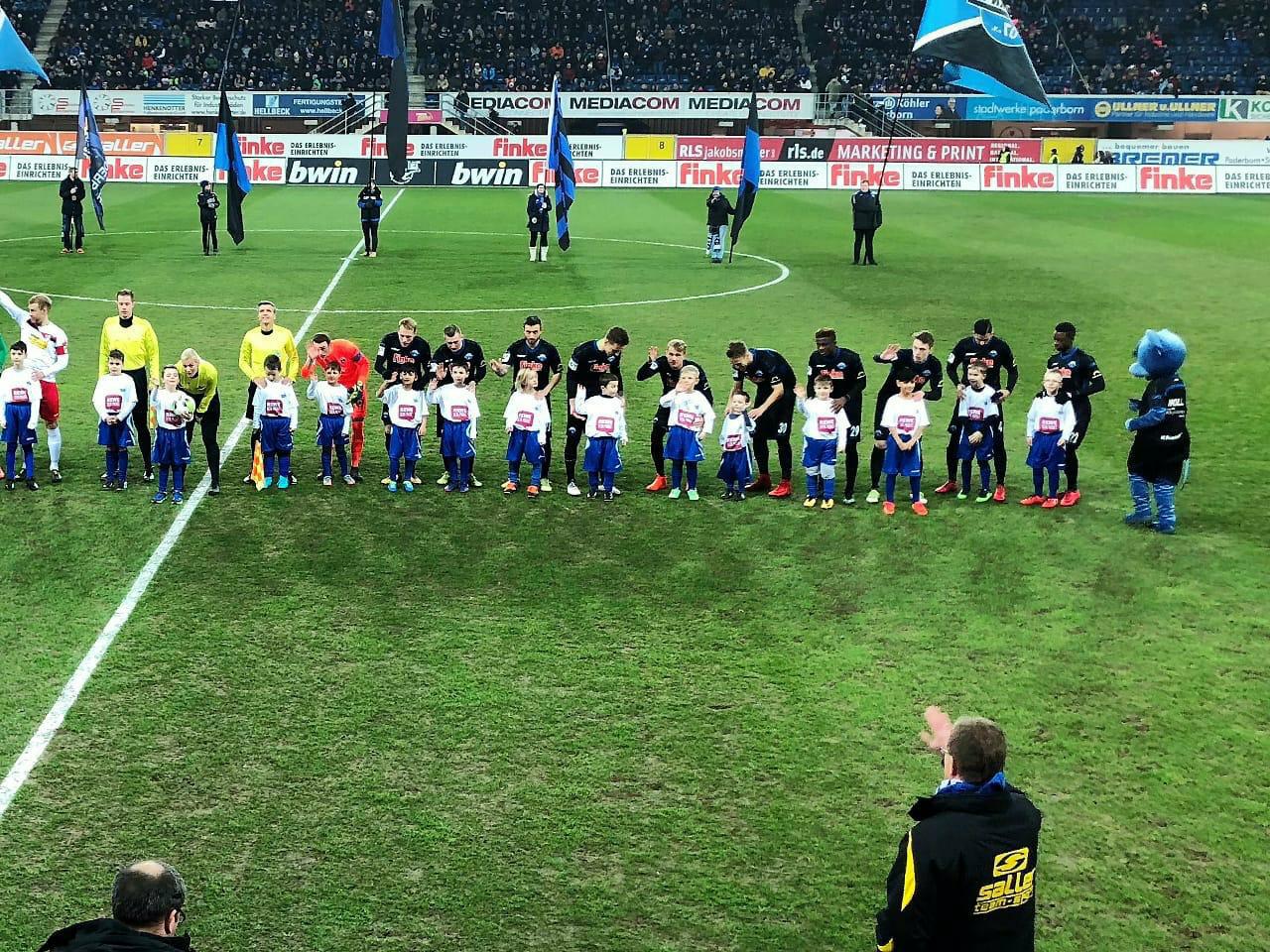 Angeführt von Schiedsrichterin Bibiana Steinhaus liefen unsere Kids zusammen mit den Profis vom SCP vor knapp 7500 Zuschauern in die Benteler-Arena ein, wo es kurz vorm Anstoß noch zur Laola-Welle vor die Fankurve der Paderborner ging.