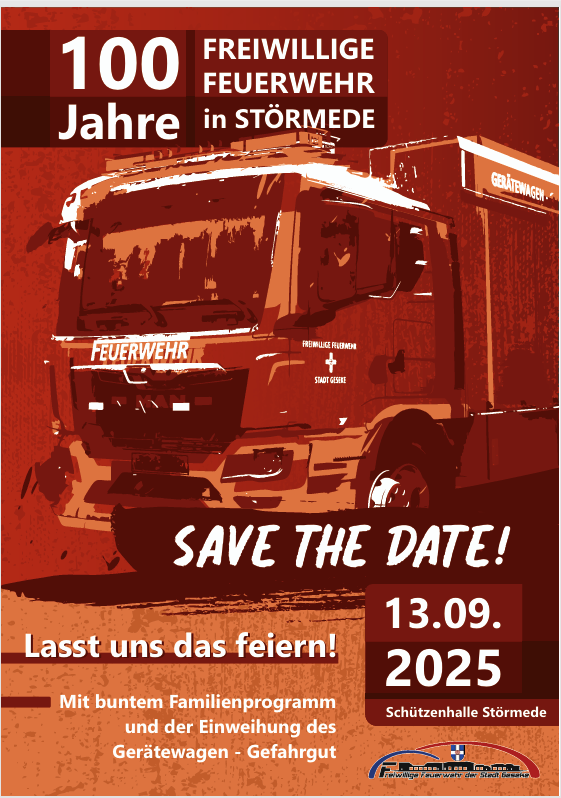 Die Feuerwehr Störmede feiert 2025 ihr 100-jähriges Bestehen! Ein herausragendes Ereignis, das wir gemeinsam feiern möchten. Merkt euch den 13. September 2025 vor, denn an diesem Tag erwartet euch ein umfangreiches Programm, das die Geschichte und das Engagement der Feuerwehr Störmede würdigt. Seid dabei, wenn wir diesen besonderen Meilenstein gemeinsam begehen und auf 100 Jahre Einsatz und Tatkraft zurückblicken.