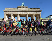 Die Grandauradler waren bei herrlichem Sonnenschein (aber nur 8 Grad) in Berlin unterwegs. Mit dem Stadtführer Max und zwei Damen aus Cottbus erradelten sie die Sehenswürdigkeiten Berlins. Geschickt verband Max die unrühmliche Geschichte Berlins (und der DDR) mit der heutigen Boomtown. Das Bild zweigt im Hintergrund die Rückseite des Brandenburger Tors. (Vorn waren zu viele Leute) Geschlafen wurde übrigens auf dem Schiff Gretha van Holland, direkt hinterm Kanzleramt.