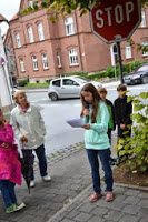 Die Plattdeutschen nahmen sich die Zeit und informierten sich bereits zum 2. Mal über Störmeder Hausstellen. Zahlreiche Störmeder nutzten diese Gelegenheit und begleiteten diesen Spaziergang. Dieses mal begannen sie an der Kreuzstraße und schauten sich die Häuser links und rechts der Langenstraße im Ortskern an. Anton Bress hatte wieder historisches Bildmaterial dabei. Josef Schulte, Elisabeth Mauermann und die Plattdeutschen Schüler lieferten die die Hintergrundinformationen aus der Dorfgeschichte. Dabei weckten sie viele Erinnerungen bei ihren Zuhörern, die diese noch mit eigenen Erinnerungen ergänzen. Günter Deiters hatte sich auf „seine Hausbesucher“ vorbereitet. Er zeigte den Gästen historische Bilder aus der Familiengeschichte. Dazu gehörten auch die Erinnerung an die alte Dorfwaage und ein Bunker aus dem II. Weltkrieg in seinem Garten. Dieser konnte besichtigt werden und dient heute als „Apfellager“. Da das Wetter nicht mitspielte brach die Gruppe ihre Tour ab. Man entschloss sich den Nachmittag gemütlich im Heimathaus zu beenden. Am Samstag den 19. Oktober um 14:00 Uhr soll dieser heimatliche Spaziergang fortgesetzt werden. Treffpunkt ist vorm Jugendeck.