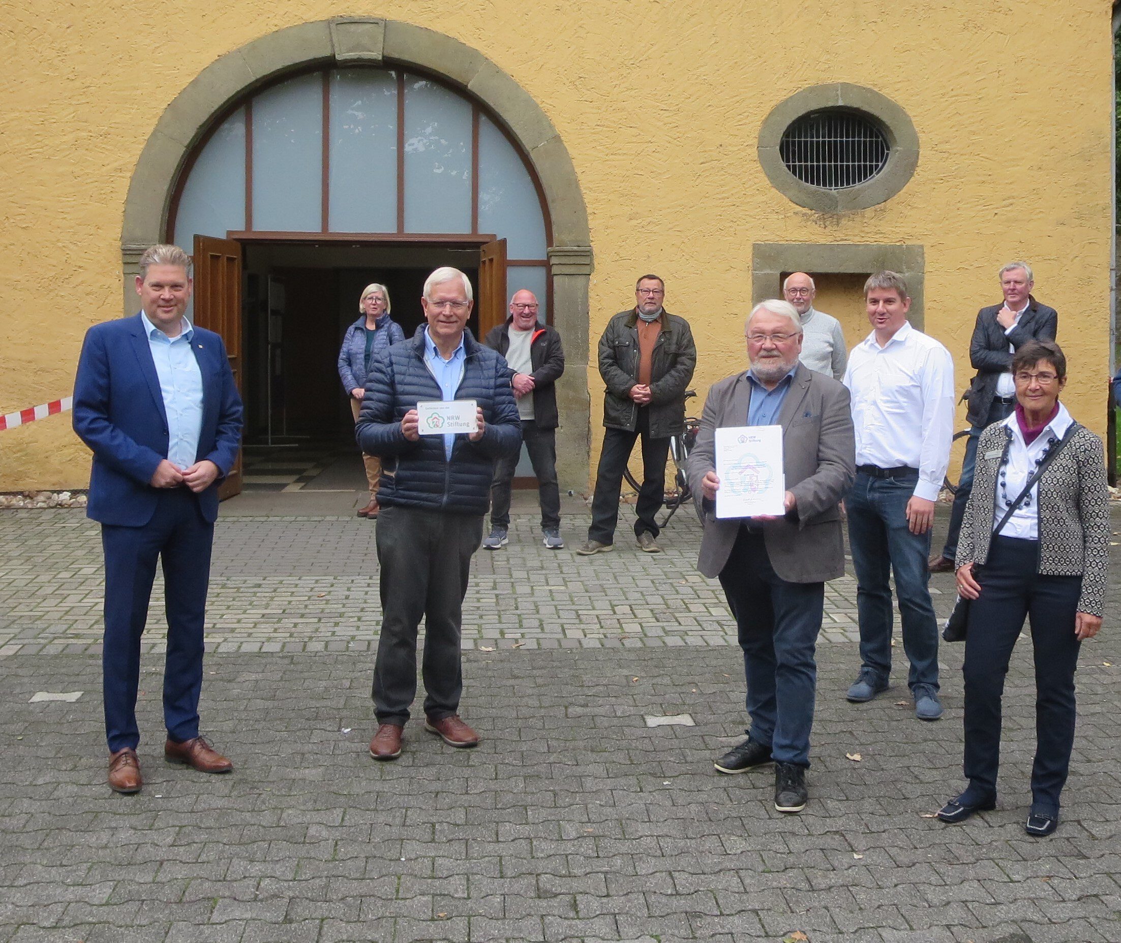 Vor dem Haus Nazareth übergibt Herr Uhlenberg, Präsident der NRW Stiftung, den positiven Förderbescheid dem 1. Vorsitzenden des Kulturring Störmede, Franz Pieper. Das Geld soll für die barrierefreie Sanierung des Haus Nazareth eingesetzt werden. Herr Uhlenberg dankt dem Kulturring und seinen Helfern für ihre ehrenamtliche Arbeit und wünscht viel Erfolg bei der Umsetzung. Seinen Dank richtet er auch an das Land NRW, vertreten durch Herrn Blöming.