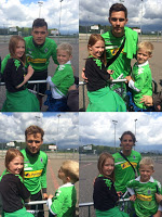 Für den eingefleischten Gladbach-Fan, Frank Steuer, ist es schon fast nichts mehr Besonderes, sich das Training seiner „Fohlen“ auf dem Trainingsgelände anzusehen. Heute waren die Stars des nächstjährigen Champions-League-Teilnehmers besonders gut drauf und liessen sich mit Anna und Timo ablichten ! Namen wie Hrgota, Sommer, Jantschke und Xhaka sind den Kindern nur zu gut bekannt, denn an fast jedem Wochenende fiebern Sie mit Papa Frank vor dem Fernseher beim Spiel der Borussen mit ! Für sie war es heute ein besonderes Highlight, die Stars „hautnah“ sehen zu können.
