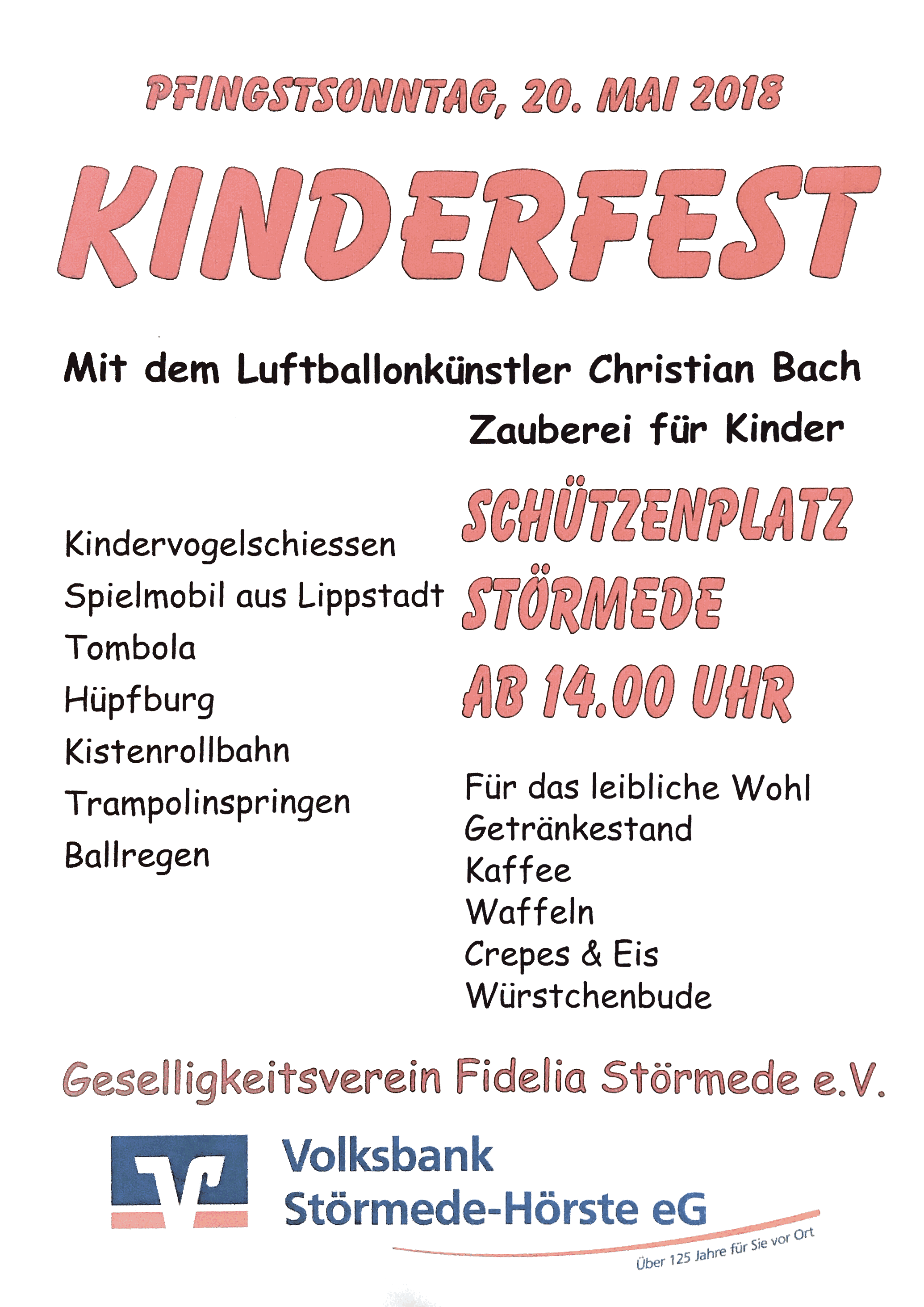 einfallen lassen, um für alle Besucher einen tollen Tag zu veranstalten. Neben Trampolinspringen, dem Lippstädter Spielmobil, der Hüpfburg der Volksbank Störmede-Hörste, der Kistenrollenbahn, der mit tollen Preisen gespickten Tombola und natürlich dem Kindervogelschießen, konnte Fidelia in diesem Jahr Christian Bach engagieren. Mit Kinderzauberei und dem Modellieren von Luftballontieren, wird er sicher Groß und Klein begeistern.