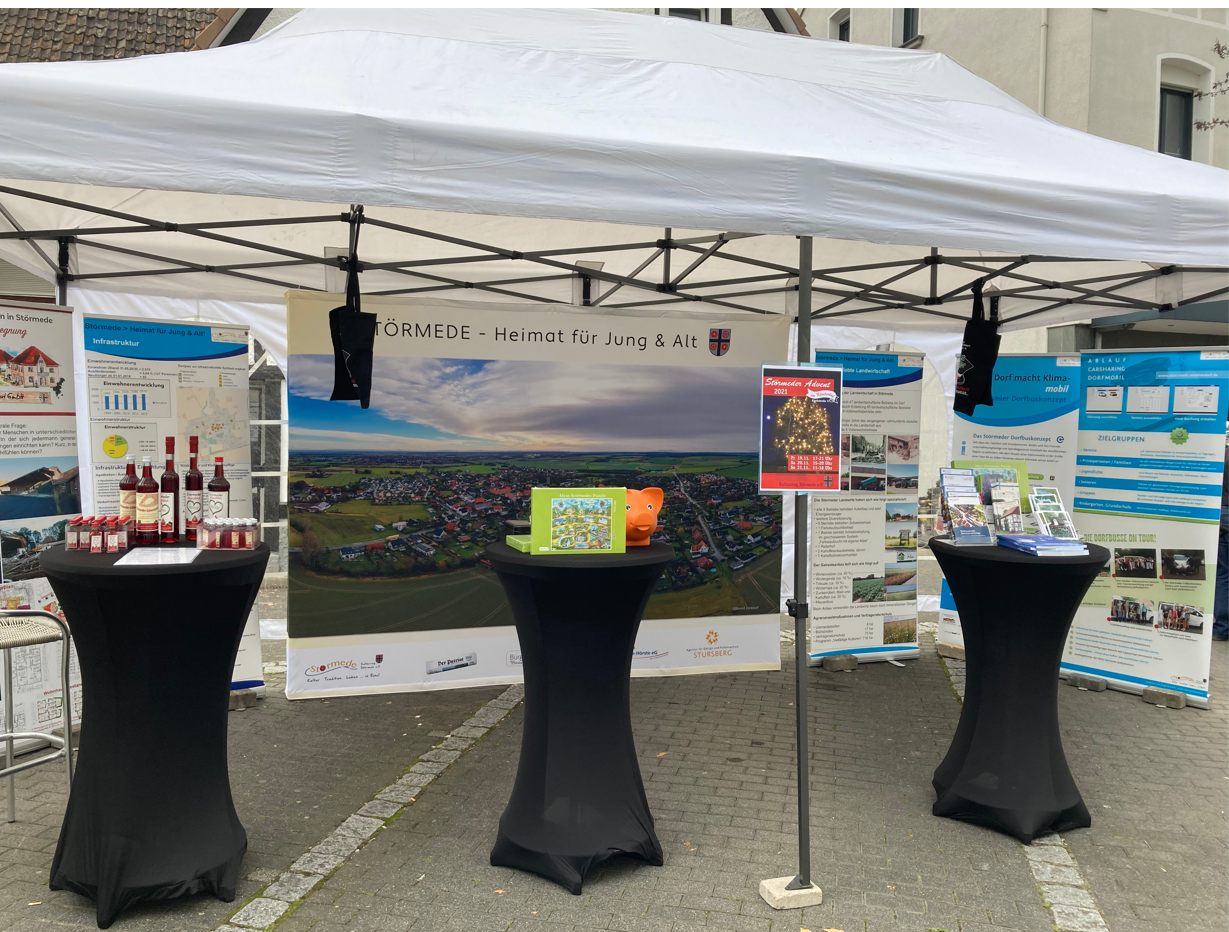 Eine ganze Menge Material hatte der Kulturring mit im Gepäck. Auf Rollups wurden viele Projekte aus dem Dorf präsentiert und eine 4m x 3m große Leinwand zeigte das Dorf aus der Vogelperspektive. Außerdem dabei war der Störmeder Herzblut und das legendären Störmeder Schweineblut vom St.Pankratius Schützenverein.