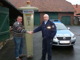 Eine ehemalige Mitarbeiterin der Polizei konnte diese Notrufsäule vor dem Schrottplatz retten und ließ sie einige Jahre im Schuppen auf ihrem Bauernhof schlummern. Aber nun, wohin damit? Dorfsherrif Jupp wurde eingeschaltet. Er knüpfte den Kontakt zum pensionierten Hauptkommissar