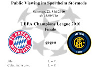 Das Endspiel im Wettstreit um die Krone des europäischen Vereinsfußball zwischen dem deutschen Meister FC Bayern München und Inter Mailand kann am Samstag dem 22. Mai im Sportheim live auf einer Großleinwand verfolgt werden. Der Förderverein der Fußballabteilung lädt nicht nur die Bayern-Fans, sondern auch alle anderen Freunde des Fußballsports ganz herzlich ein, gemeinsam das Endspiel um die Champions-Liga zu verfolgen. Die Einladung findet Ihr hier: