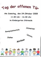 Am Samstag, den 24. Oktober findet im Störmeder Kindergarten ein Tag der offenen Tür statt. Geöffnet ist von 11.00 – 16.00 Uhr. Neben Malschleuder und Bewegungsbaustelle wird es auch eine Cafeteria geben. Für die Eltern, deren Kinder erst in naher Zukunft den Kindergarten besuchen, eine gute Gelegenheit, die Räumlichkeiten schon einmal kennen zu lernen. Das Team um Christiane Machoy freut sich auf zahlreiche Besucher.