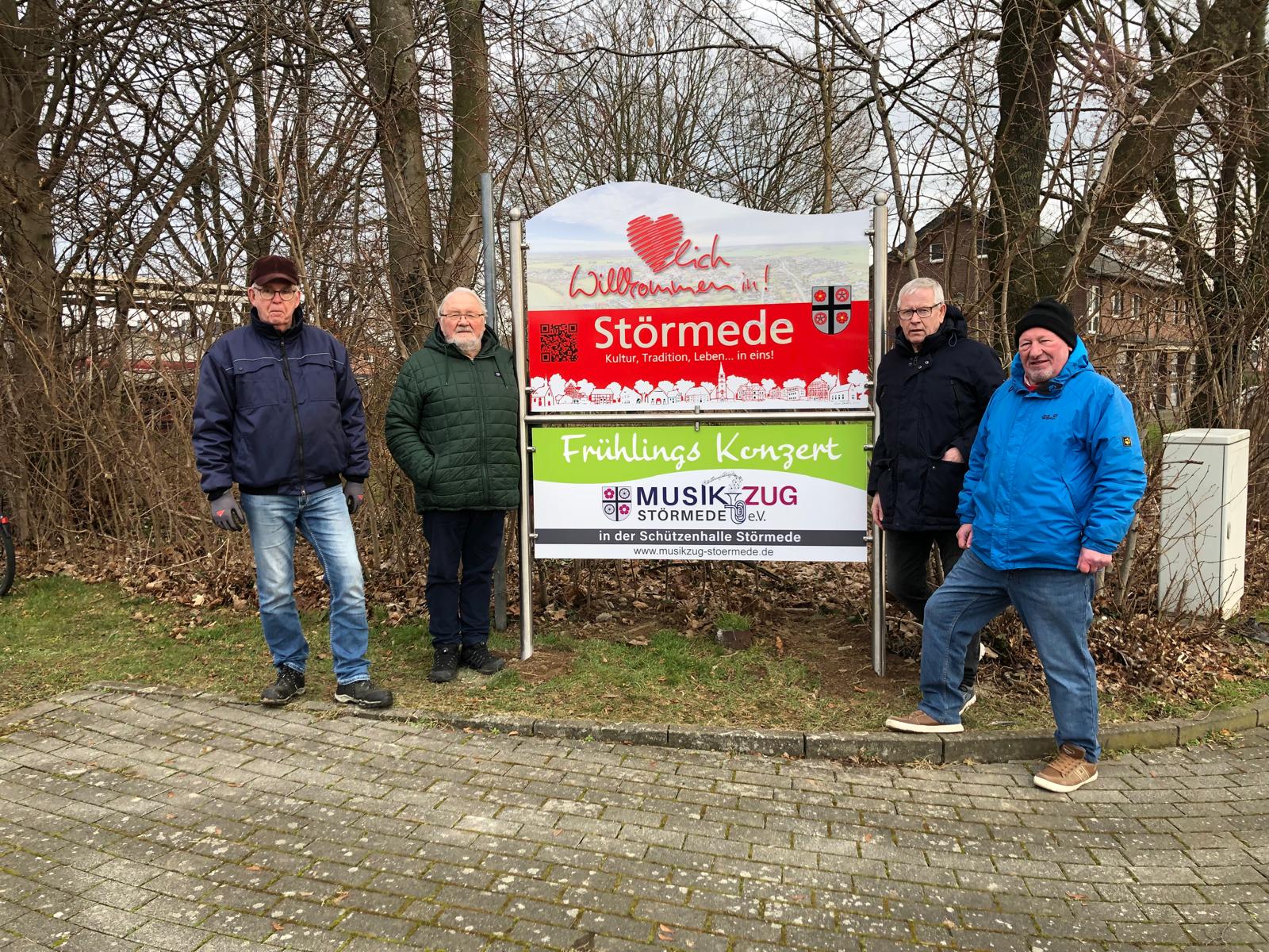 Der untere Teil des Schildes kann ausgetauscht werden und zeigt die Veranstaltungen der Vereine. Aktuell lädt der Musikzug Störmede zum Frühlingskonzert am Samstag, den 12.04.2025 ab 20 Uhr herzlich in die Schützenhalle Störmede ein.
